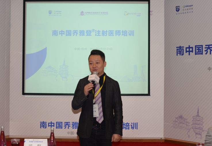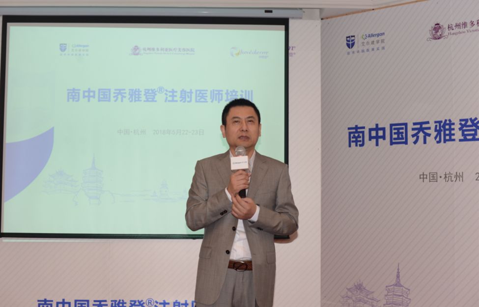 杭州维多利亚医疗美容医院院长程健欢迎词,他赞赏美国艾尔建公司作为全球医疗美容领域的领导者,致力于中国医疗美容市场的培育和开发,培训注射医师,树立中国医美市场优良风气的行为。